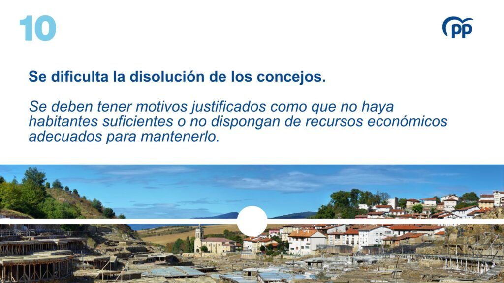 A continuación, se enumeran las principales incorporaciones de la propuesta planteada por el Partido Popular a la nueva Norma Foral de Concejos, entre otras: