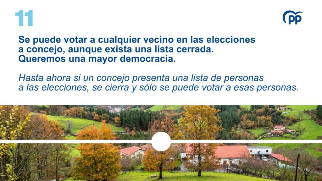 Se puede votar a cualquier vecino en las elecciones a concejo, aunque exista una lista cerrada.Hasta ahora si un concejo presenta una lista de personas a las elecciones, se cierra y sólo se puede votar a esas personas. Queremos una mayor democracia.