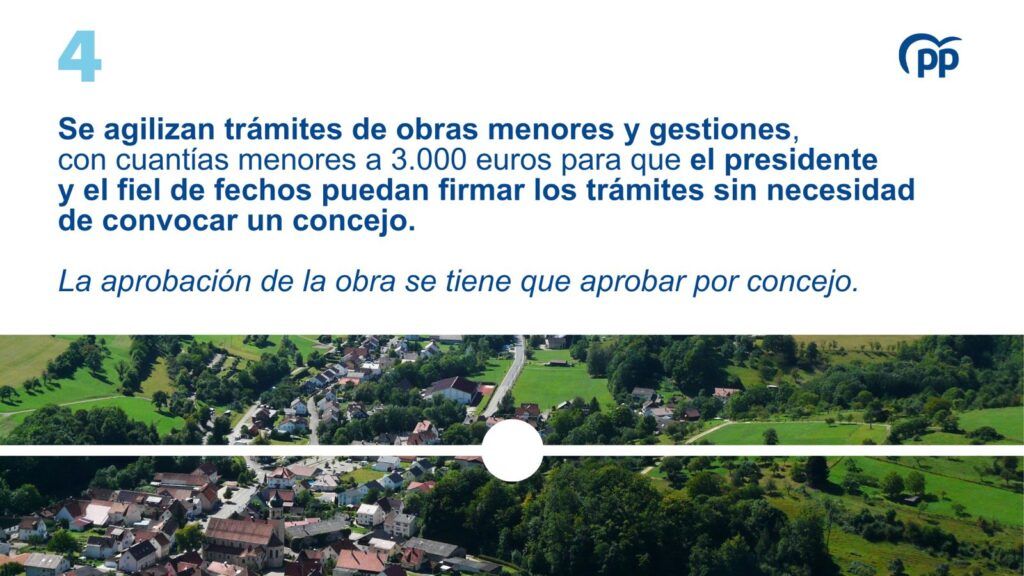 Se agilizan trámites de obras menores, gestiones, con cuantías menores a 3.000 euros para solucionar los problemas del pueblo con mayor celeridad. Se permitirá que el presidente y el fiel de hechos puedan firmar estos trámites sin necesidad de convocar un concejo. Eso sí, la aprobación de la obra que se vaya a realizar, por ejemplo, se tiene que aprobar por concejo.
