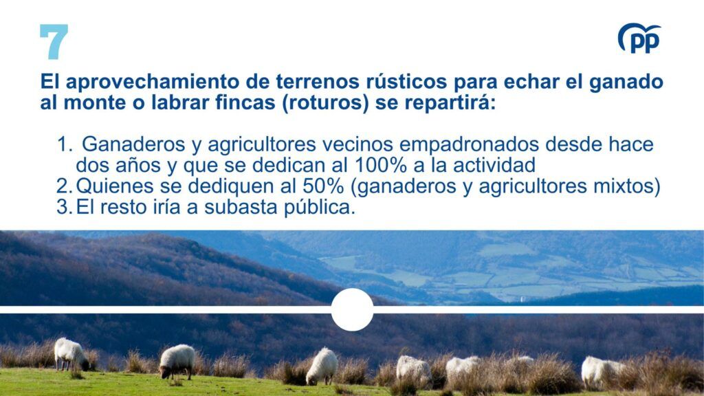Se da prioridad a los ganaderos y agricultores vecinos empadronados desde hace dos años y que se dedican al 100% a la actividad al aprovechamiento de terrenos rústicos para echar el ganado al monte o labrar fincas (roturos). Segundos, quienes se dediquen al 50% (ganaderos y agricultores mixtos). Y el resto iría a subasta pública.
