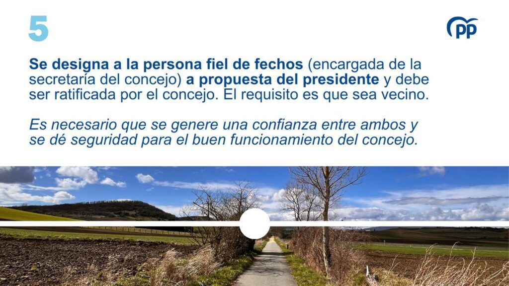 Se designa a la persona fiel de fechos, encargada de la secretaría del concejo, a propuesta del presidente y debe ser ratificada por el concejo. Para el PP es necesario que se genere una confianza entre ambos y se dé seguridad para el buen funcionamiento del propio concejo. El requisito es que sea vecino.